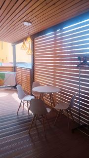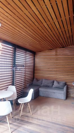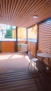 С гостиной выход на просторную террасу. На террасе обеденный стол, стулья, 2-х спальный диван, сушилка жля белья, гладильная доска.