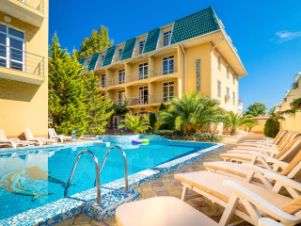 Придомовая территория огорожена забором, на территории есть подогреваемый бассейн с зонтиками и шезлонгами. Кроме этого есть зона отдыха.