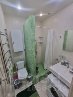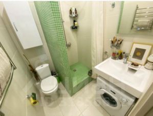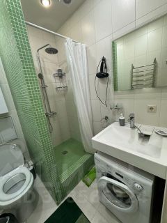 Санузел совмещенный, оснащен зеркалом, унитазом, душевой кабиной, стиральной машиной, феном.