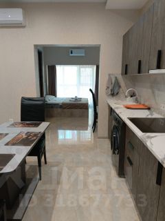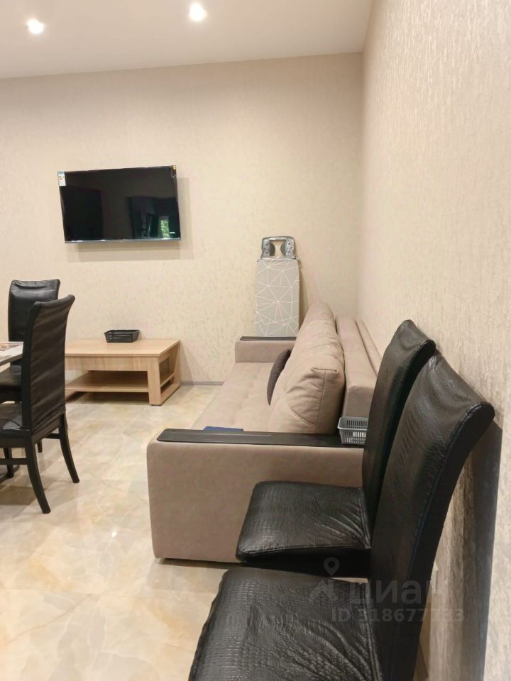 Квартира-студия, в спальне имеется двухспальная кровать с двумя тумбами, стол, кондиционер, телевизор, утюг, гладильная доска, выход на балкон. Гостиная — диван, комод с зеркалом, шкаф-купе, обеденный стол, стулья, кухонный гарнитур, холодильник, стиральная машина, варочная панель, микроволновка, эл. чайник, посуда. В ванной комнате — стационарны фен, эл.полотенцесушитель