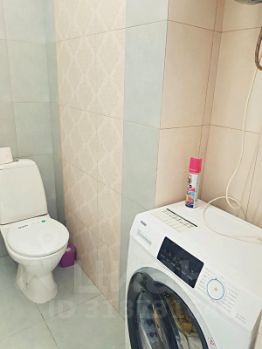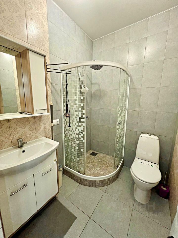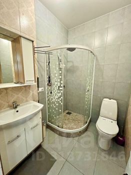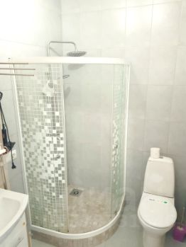 Санузел совмещенный, оснащен зеркалом, унитазом, душевой кабиной, стиральной машиной, феном.