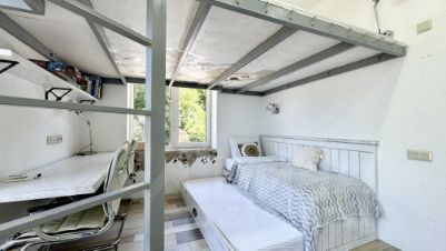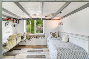- Малая спальня с двумя уровнями: 1 уровень с 2 односпальными кроватями, 2 уровень с двуспальной кроватью.