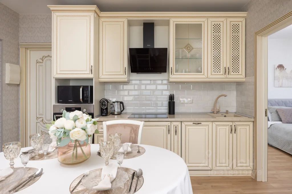 Современная кухня с варочной панелью, духовым шкафом, микроволновой печью