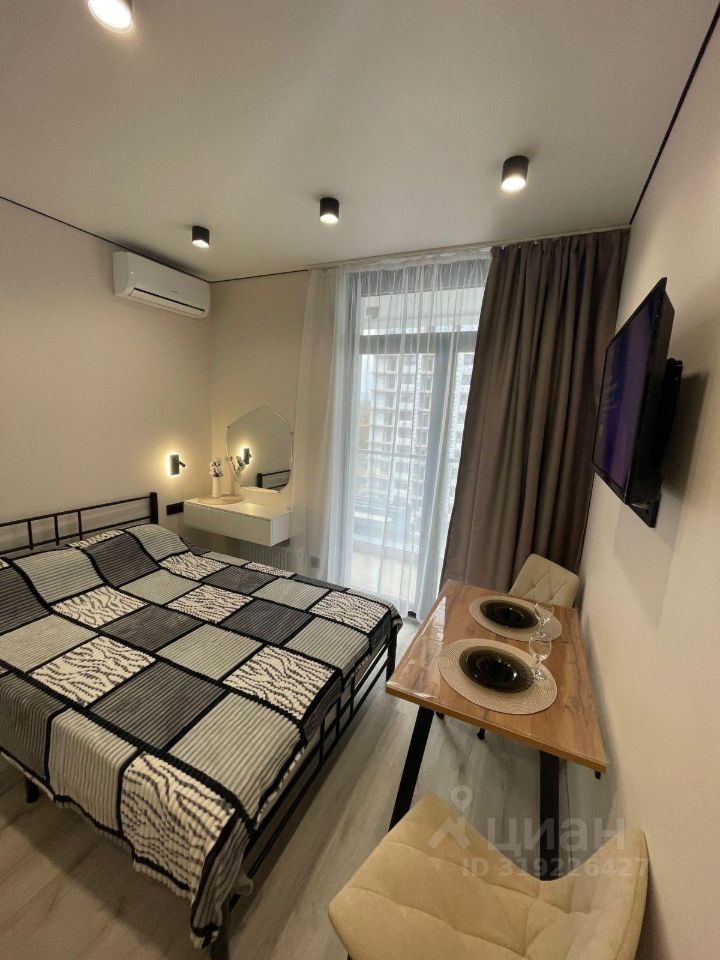 Сдается уютная студия в новом доме по адресу: Россия, Краснодарский край, Сочи, микрорайон Бытха, Ясногорская улица, 16/2к7. Квартира находится на 8 этаже 19-этажного дома, построенного в 2023 году. Общая площадь — 18. м, идеально подходит для одного человека или пары.