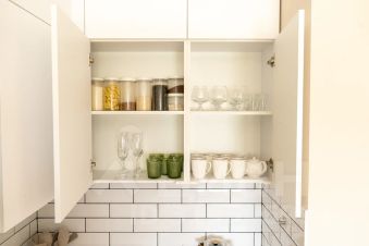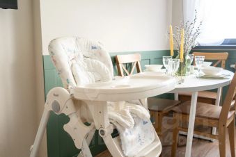 В кухонной зоне: холодильник, микроволновая печь, варочная панель, духовой шкаф, чайник, необходимая посуда, столовые приборы и принадлежности, стульчик для кормления