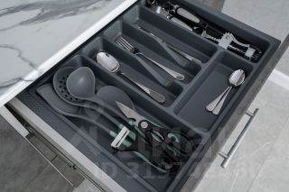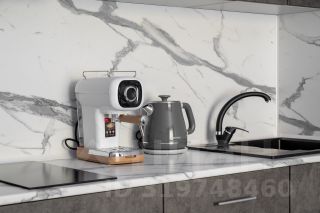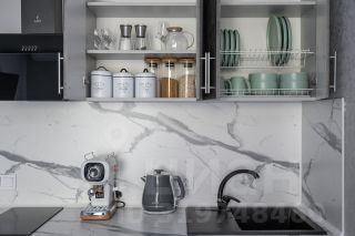 В полностью укомплектованной кухонной зоне: холодильник, варочная панель, чайник, кофемашина, необходимая посуда, столовые приборы и принадлежности