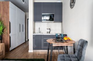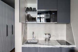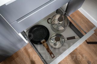 В кухонной зоне: холодильник, микроволновка, варочная панель, чайник, необходимая посуда, столовые приборы и принадлежности