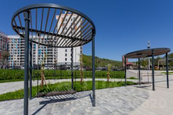 Море 15 мин на авто и 20 минут пешком. Рядом с воротами ЖК остановка общественного транспорта.