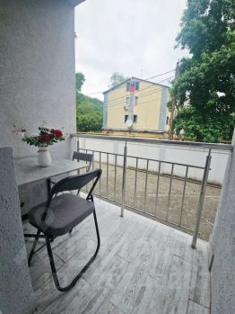 В номере студио полностью открытый балкон. На балконе стол и стулья. Апартаменты комплектуются 2-х спальным диваном-кроватью и 1 спальным креслом кроватью ( длина 170 см). Апартаменты оборудованы всем необходимым. В них стиральная машина, кондиционер, телевизор. На кухне - холодильник, чайник, индукционная плита, необходимая посуда.