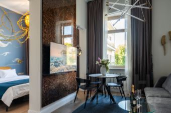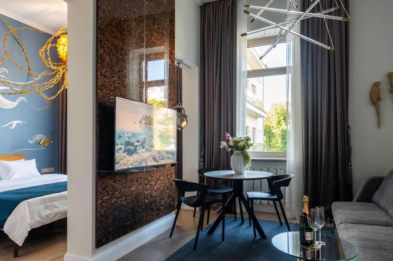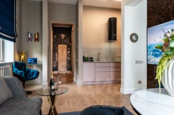 Апартамент полностью меблирован. Есть отдельная спальная зона с кроватью "Queen size", кухня-гостиная со стильным кухонным гарнитуром и рабочим местом. Вся бытовая техника в квартире современная. В вашем распоряжении будет холодильник, микроволновка, посудомоечная машина, стиральная машина с сушкой, кондиционер и телевизор.