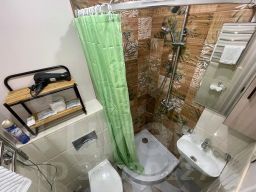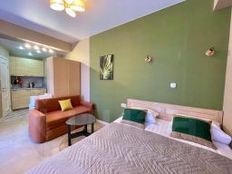 Для 3 гостей: большая кровать + диван, Smart-TV, Wi-Fi, тёплые полы. Также есть мини-кухня с посудой: микроволновка, плита, холодильник.