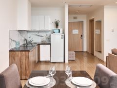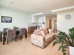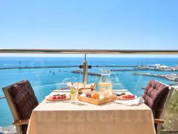 В большой гостиной комнате есть кухня, где Вы можете приготовить любые блюда и насладиться ими, обедая на балконе с видом на море, обеденная зона в гостиной на 6 человек, двуспальный диван и большой смарт ТВ