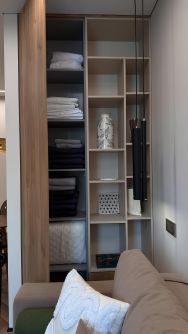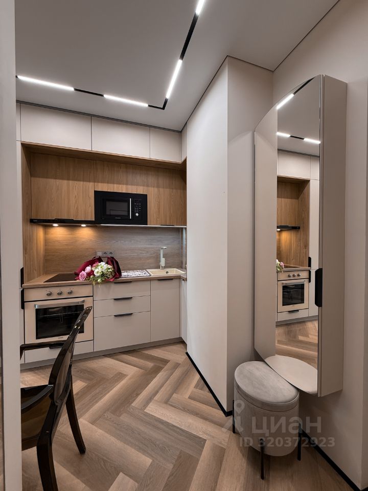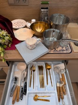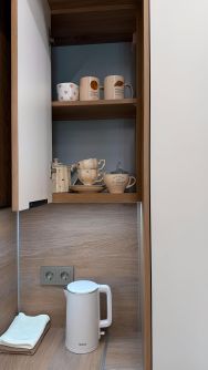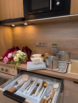 Кухня оборудована встроенным холодильником, морозильной камерой, индукционной плитой на 2 конфорки, духовкой Gorenje - умная техника нового поколения с заботой о комфорте.