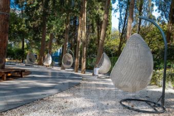 - Детская площадка с качелями, слуховыми трубами, холмами с мягким покрытием, верёвочным парком и креслами-коконами