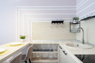 Кухонная зона со всем необходимым: варочная поверхность, чайник, микроволновка, посуда и кухонная утварь;