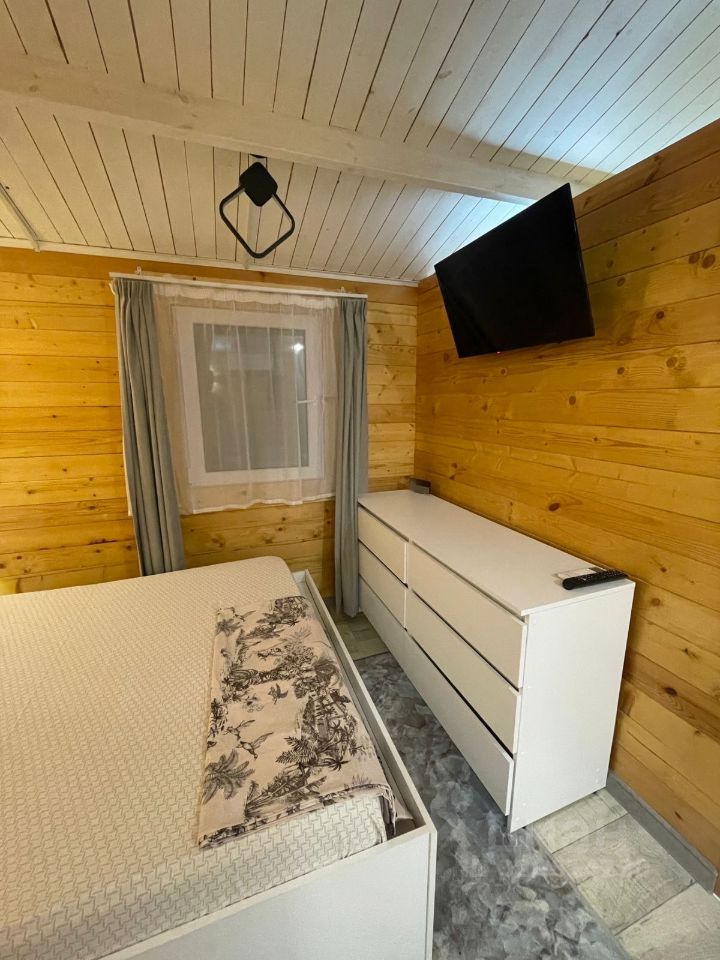 Удобства в шале: шкаф, тумба, комод, диван (трансформируется в дополнительное спальное место), телевизор, кондиционер, фен, полотенца, санузел, чайник, мини холодильник.
