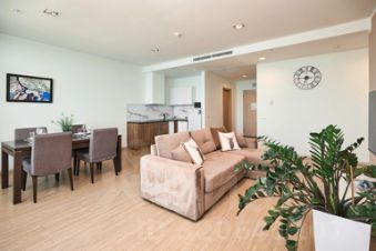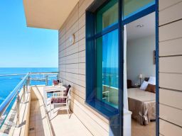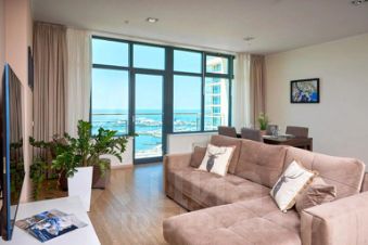 Апартаменты имеют три комнаты: две отдельные спальни, одна из которых с выходом на балкон, санузлом и гардеробной, и гостиную. В гостиной оборудована кухня, обеденная зона на шесть человек, двуспальный диван и смарт-ТВ. В квартире есть постельные и банные принадлежности, пляжные полотенца, халаты, тапочки, стиральная и сушильная машины, гладильная доска, утюг, фен, холодильник, электрочайник, микроволновая печь, индукционная плита, посуда, посудомоечная машина, Wi-Fi, телевизоры в каждой комнате. Предоставляется гигиенический набор. По отдельному запросу возможно аренда парковочного места.