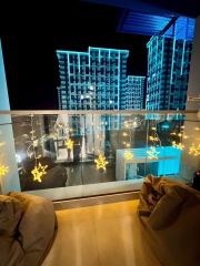 Просторный балкон с пуфами и колонкой для отдыха и релакса
