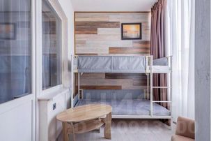 Подходят для 4-6 гостей, в апартаментах две спальни и большая гостиная, в спальне двуспальная кровать, в второй спальне двухъярусная кровать, в гостиной двуспальный диван.