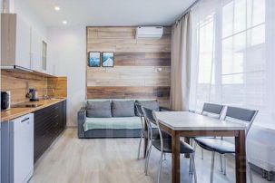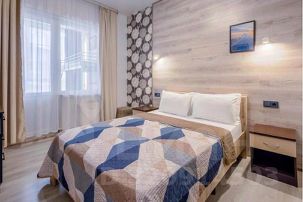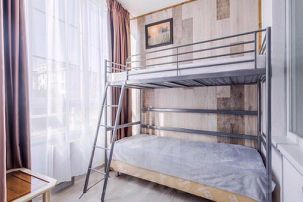 Подходят для 4-6 гостей, в апартаментах две спальни и большая гостиная, в спальне двуспальная кровать, в второй спальне двухъярусная кровать, в гостиной двуспальный диван.