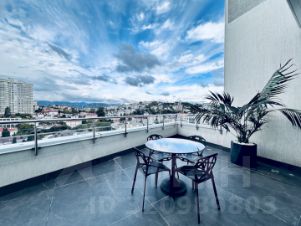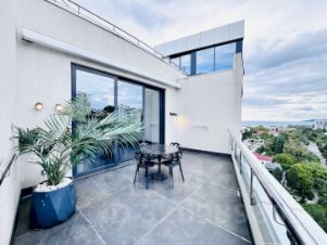 Просторный открытый балкон, оснащенный столиком и креслами, дарит великолепный вид на море и город