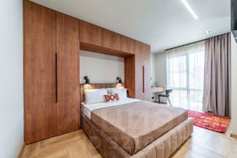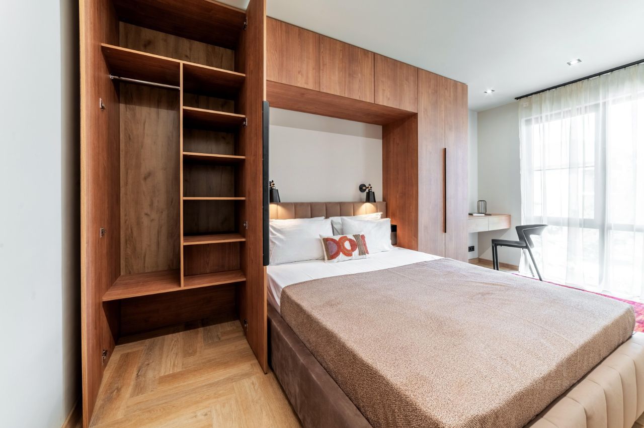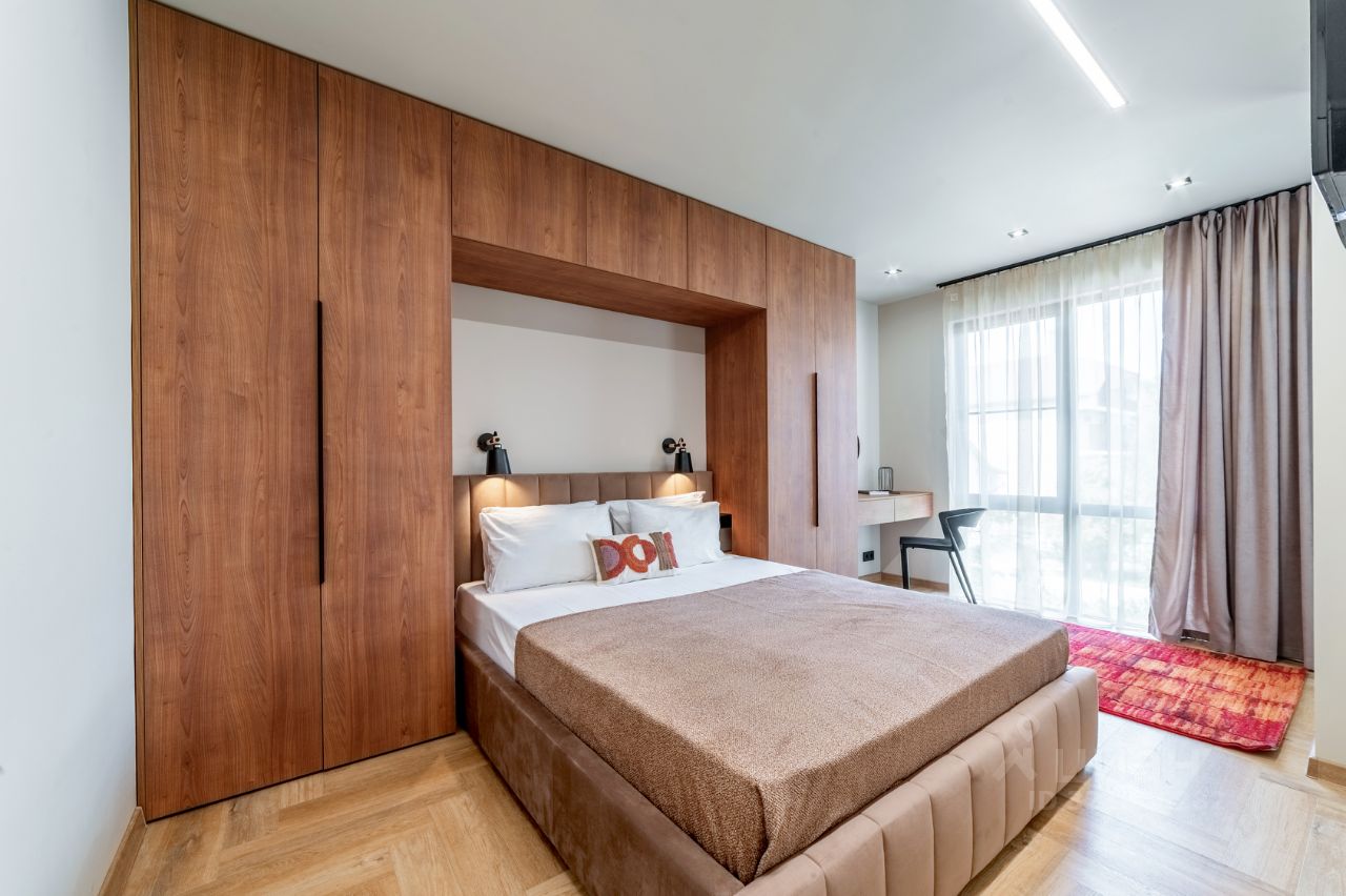 — спальня с двуспальной кроватью и ортопедическим матрасом 160 см., двумя большими вместительными шкафами для одежды, в которых на нижнем ярусе предусмотрено два места для чемоданов, туалетным/письменным столом и ТВ;