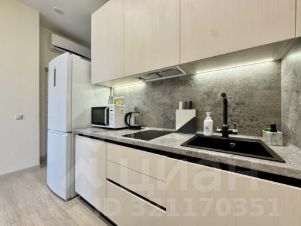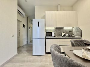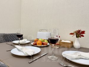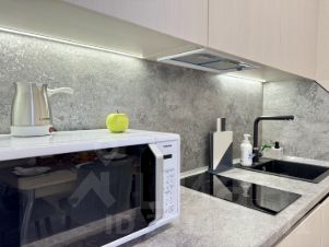 Современная кухня с варочной панелью, встроенным холодильником, посудой, микроволновкой, электрочайником и даже электроштопором для удобства.