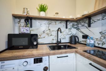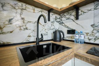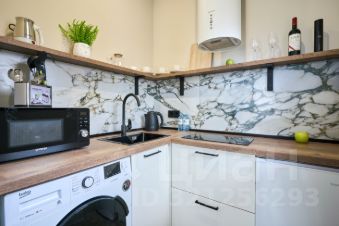 Современная кухня с варочной панелью, встроенным холодильником, посудой, микроволновкой, электрочайником и даже электроштопором для удобства.