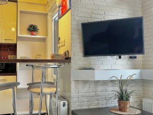 Полностью укомплектована всем необходимым для комфортного проживания: полотенца, постельное белье, посуда, утюг, микроволновая печь, кондиционер, шкаф для хранения вещей, стиральная машинка, душевая кабина, диван-кровать, кресло-кровать (вместимость до 3х взрослых).
