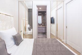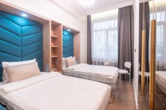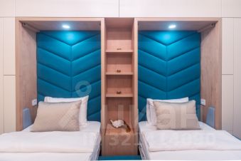 Апартамент включает две спальни. В одной из них 2 кровати 140*200, встроенные в стену с механизмом раскладки, что позволяет максимально эффективно использовать пространство. Во второй спальне — просторная общая кровать 220*240.