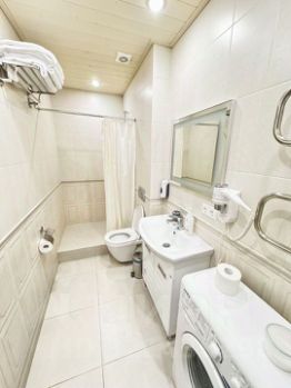 В квартире есть все необходимое: кухонный гарнитур, посуда, холодильник, СВЧ-печь, плита, электрический чайник, стиральная машина, 4 спальных места (двуспальная кровать, диван-кровать), ванная комната, утюг, гладильная доска, сушилка для белья, фен, постельное белье, полотенца.