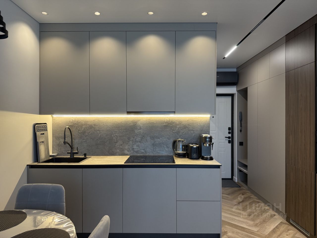 Кухонная зона оснащена всей необходимой премиальной техникой и посудой: