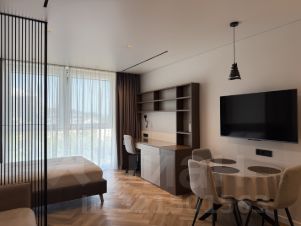Современная светлая студия с панорамным остеклением и видом на море в жилом комплексе бизнес-класса Новая Альпика. Свободна.