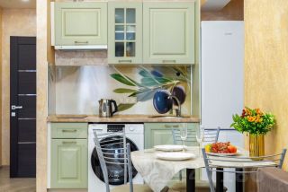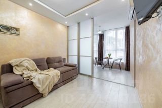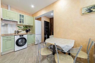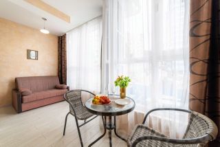 Кухня-студия: диван-кровать (2 спальный), обеденный стол, 4 стула, ТВ, холодильник, кондиционер, эл. чайник, микроволновка, варочная панель посуда, приборы, сковородки, полотенца.