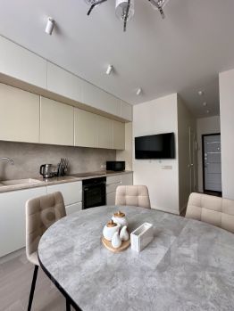 Квартира с евроремонтом, полностью готова к проживанию. Просторная кухня площадью 10 кв. м оснащена всей необходимой мебелью и современной техникой: холодильник, посудомоечная машина, кондиционер, телевизор. В комнате также есть вся необходимая мебель, поэтому вы сможете сразу же почувствовать себя как дома. Ванная комната оборудована душевой кабиной, здесь же установлена стиральная машина. Квартира подключена к интернету, что позволит вам оставаться на связи и работать в комфортных условиях.