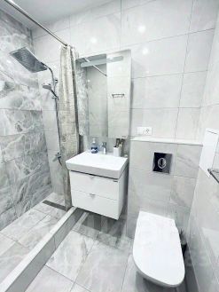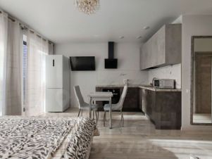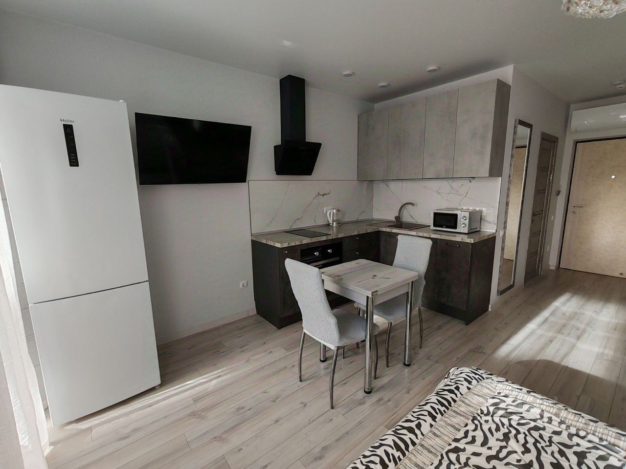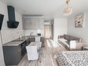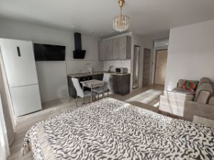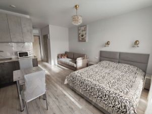 Сами апартаменты представляют собой студию с новым ремонтом. Вся техника и мебель куплена под апартаменты. Студия снабжена всем необходимым: кухня с духовым шкафом, микроволновой печью, большим холодильником, варочной панелью, посудой; стиральная машина, фен, утюг, гладильная доска, телевизор смарт и wi-fi.