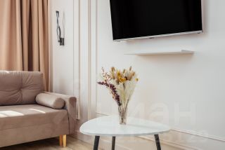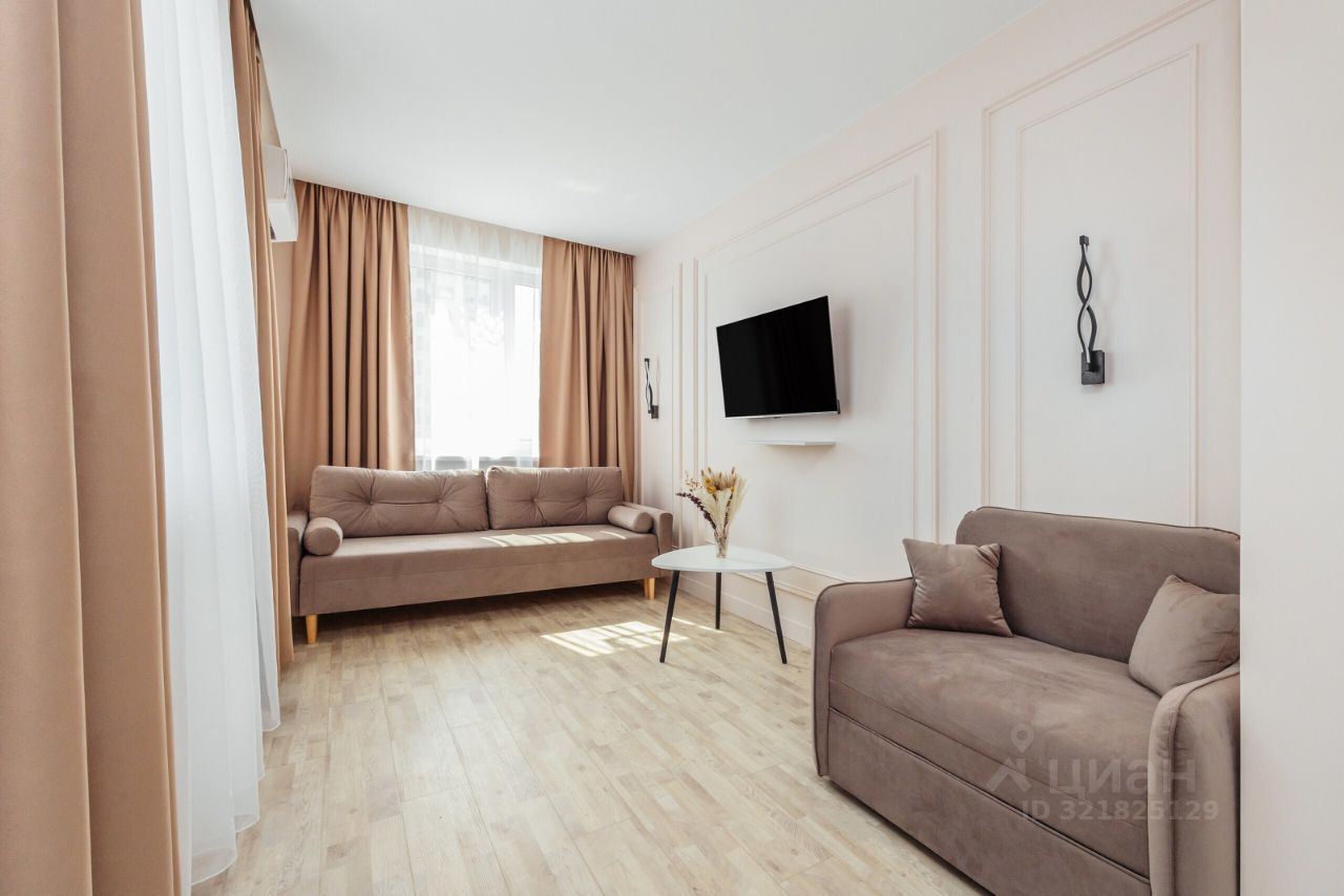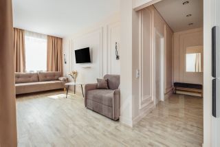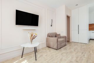 В гостиной расположен двухспальный диван-кровать и кресло-кровать, Smart TV и журнальный столик.