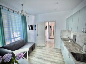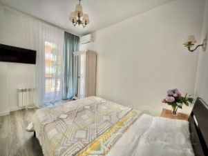 Данные апартаменты имеют спальню С ВЫХОДОМ НА БАЛКОН и кухню-гостиную с большим французским окном.