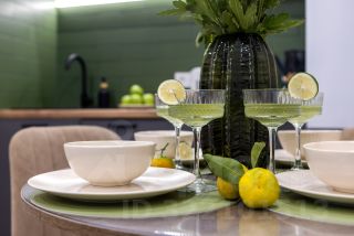 Полноценный кухонный уголок: плита, СВЧ, холодильник, посудомоечная машинка, посуда, чайник