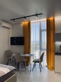 Оборудованная всём необходимым: кондиционер, посуда, столовые приборы, чайник,плита, холодильник , фен, утюг, полотенца, телевизор , Wi-Fi )