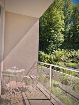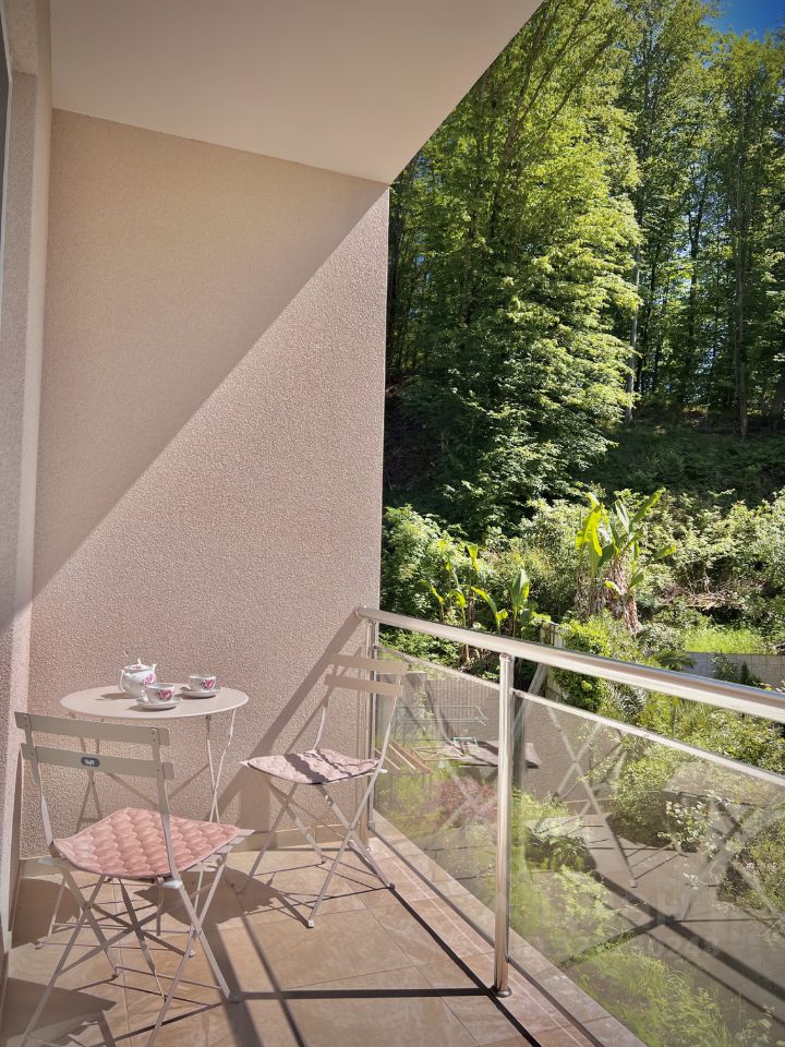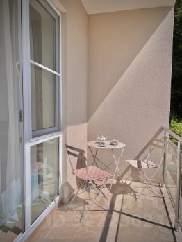 Данные апартаменты имеют спальню С ВЫХОДОМ НА БАЛКОН и кухню-гостиную с большим французским окном.