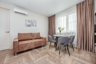 Квартира оснащена: стабильным высокоскоростным интернетом (оптоволокно), качественными кондиционерами, теплыми полами и системой отопления, дорогим текстилем: постельное белье и полотенцами.