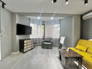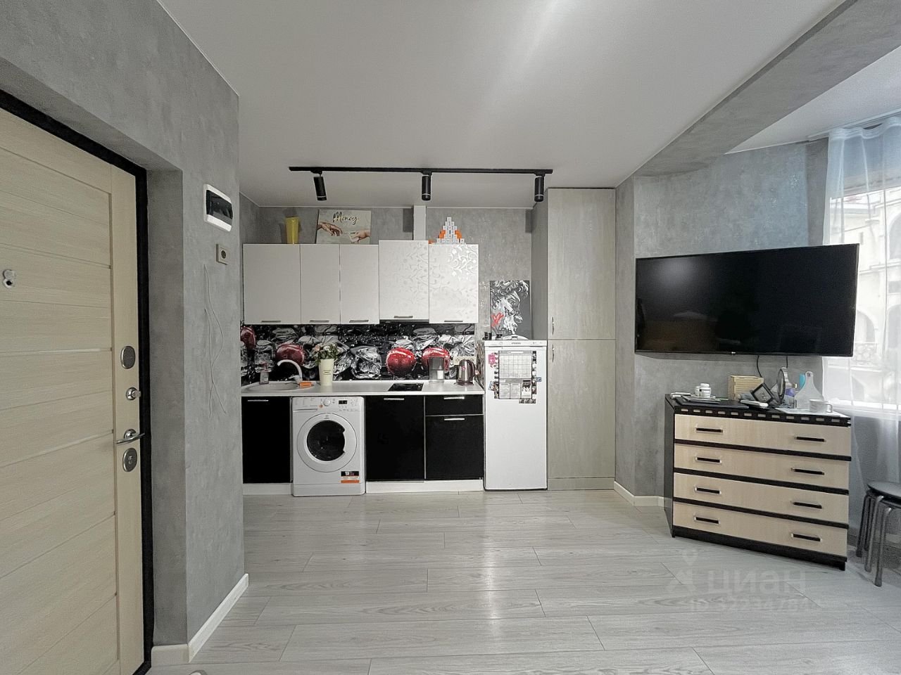 В квартире есть мебель и техника : диван-кровать, кресло, комод, телевизор, кухонный гарнитур, стиральная машинка, шкаф для хранения вещей, санузел, кондиционер.