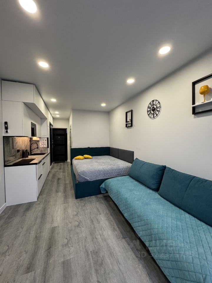 Студия выполнена в дизайнерском стиле и полностью меблирована. кровать двуспальная с дорогим качественным матрасом. На кухне есть всё необходимое для комфортного проживания. Установлена современная техника: кондиционер, холодильник, телевизор и стиральная машина. Санузел совмещённый, оборудован душевой кабиной.