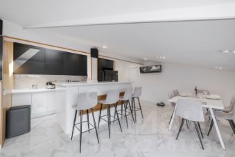- Сама квартира двухуровневая, первый этаж распланирован в гостиную и спальню с выходом на балкон где есть барбекю и вид на море.