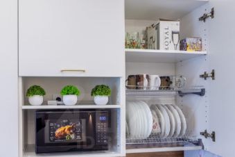 На кухне электрическая плита, вытяжка,микроволновка,чайник, холодильник и полный набор необходимой посуды