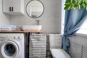 Ванная комната: ванна, косметические средства (шампунь, гель, мыло), чистые полотенца. Дополнительно: утюг с гладильной доской, фен и стиральная машина.