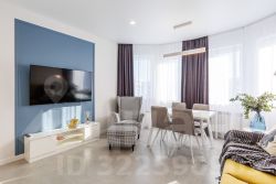 В гостиной установлен диван, большой телевизор с функцией Смарт-ТВ, обеденный стол и кресло для отдыха. Текстиль предоставляется. Wi-Fi доступен.