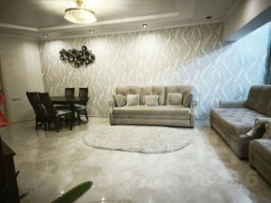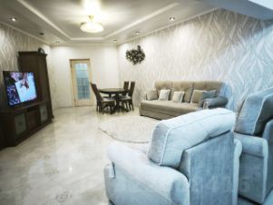 Гостиная: Светлая комната с двумя раскладными диванами на двуспальные места, креслом, телевизором и красивой мебелью. Обеденный стол с мягкими стульями. Панорамные окна с видом на море. Туалетный столик с пуфиком.