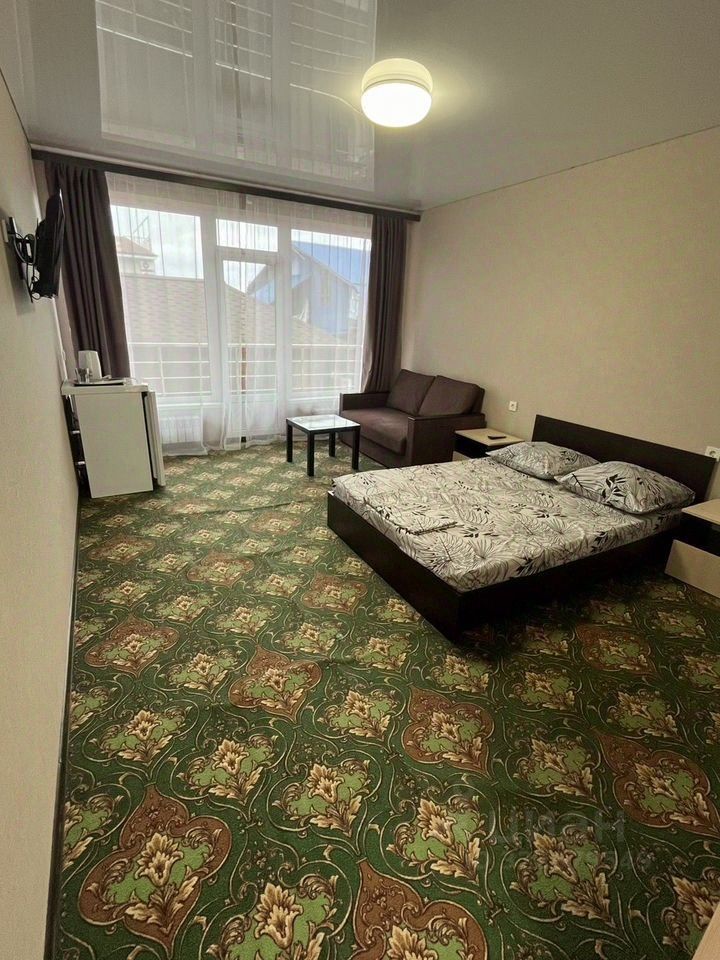 В комнате кровать, шкаф, тумба, чайник, телевизор, холодильник, душ и туалет.
